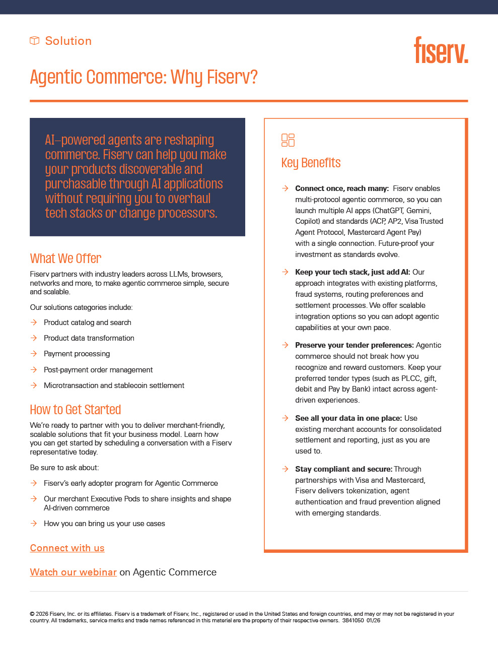 This one-pager highlights how Fiserv can help our clients make their products discoverable and purchasable through AI agents. With our one-to-many multi-protocol design and scalable integration options, Fiserv can help our clients succeed in agentic commerce without needing them to change processors or overhaul their tech stack.