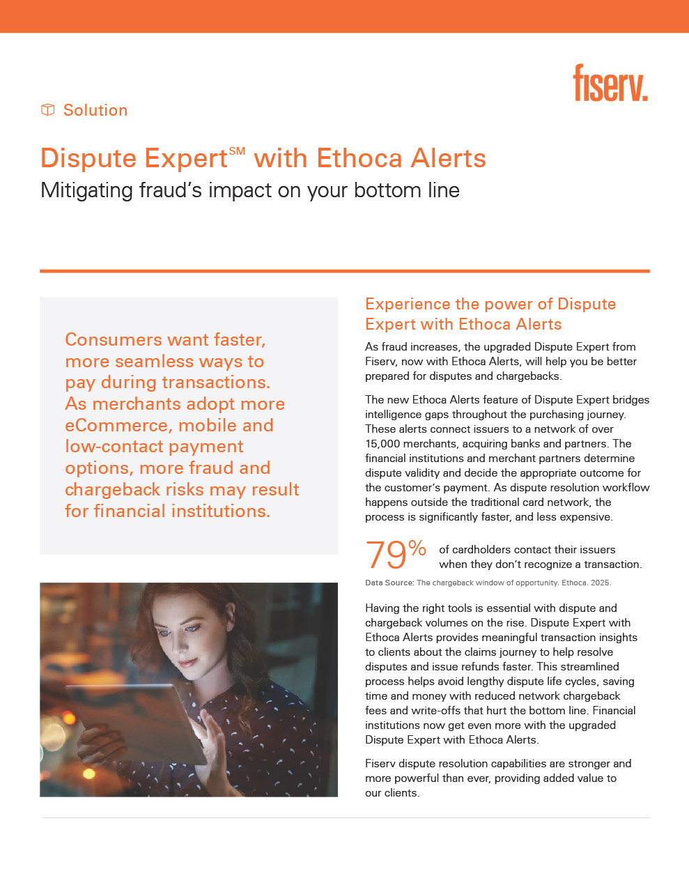 For more information about Dispute ExpertTM: Ethoca Alerts and other Fiserv solutions, call us at 800-872-7882 or click below.